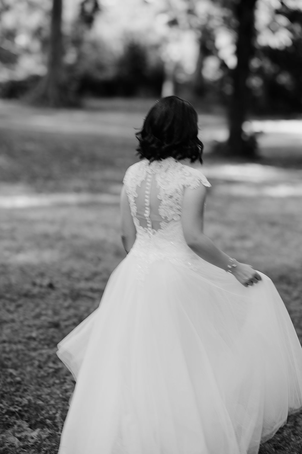Hochzeitspaar geht auf der Wiese weg zum Brautpaarshooting Rittergut Orr Hochzeitslocation